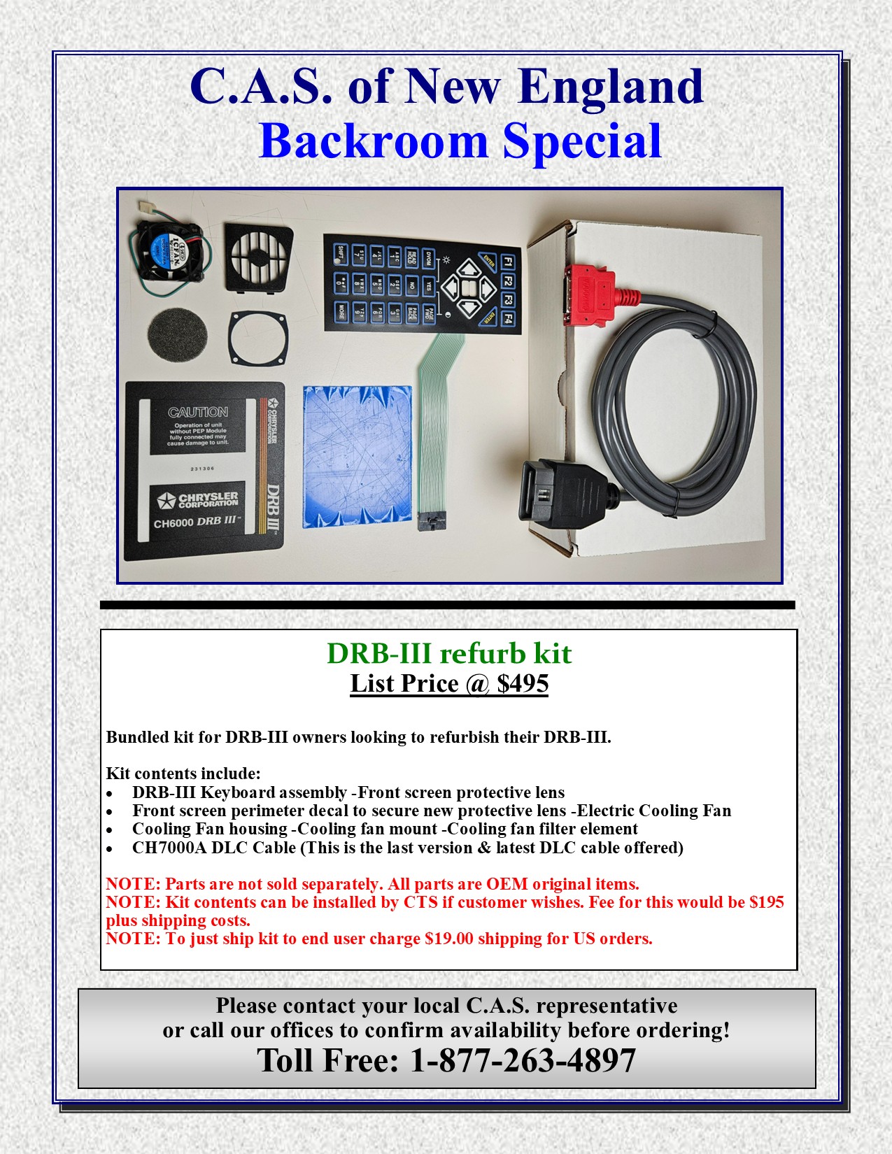 A DRB3 Refurb Kit ?: It seemed crazy at first, offering a refurb kit for the old Chrysler factory tool but we keep getting enquires from business' asking for a DRB-III, often times because their DRB3 is broken. Calls from both independents and franchised dealerships along with DIY's that own a classic Chrysler. Years ago, repair service on the DRB-III was discontinued, at that time CAS contacted the DRB-3 repair department and was able to purchase all their inventory of repair parts, hundreds of parts. And over the years we have been offering repairs on this tool when no one else would. But stock is dwindling down, and we thought we would offer a 'Refurb' kit that contains all the common components that a tired DRB-3 could use to be kept in service. Things like the final and latest DLC cable, a new keyboard, a new screen overlay, new cooling fan and even the dust filter for the fan are all part of this kit.